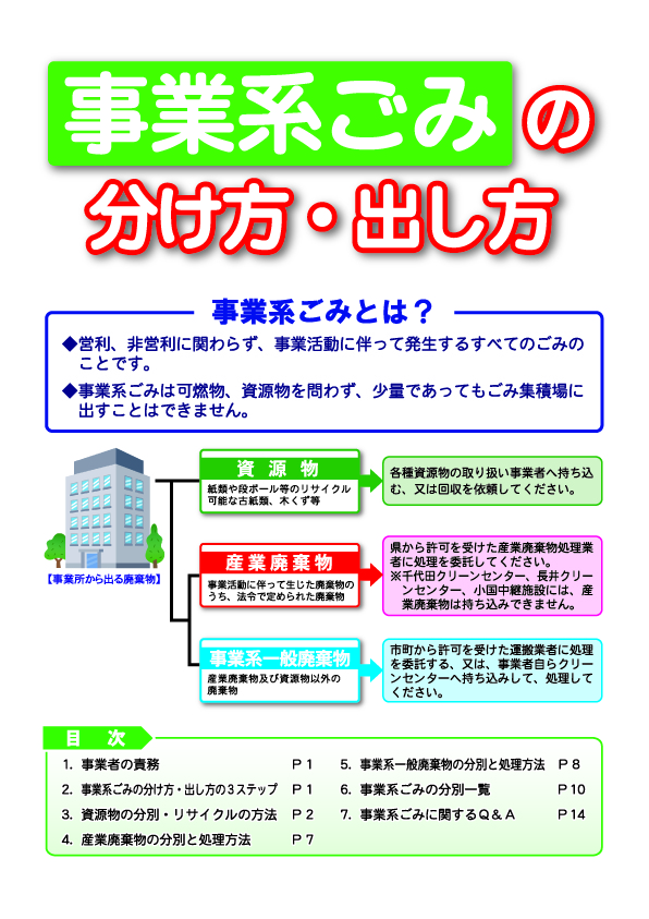 事業系ごみの分別方法や出し方をまとめた パンフレットを作成しました。ごみの分類や分別時の注意点など、適切な処理に役立つ内容を掲載しています。 事業者の皆さまの適正処理にぜひご活用ください。