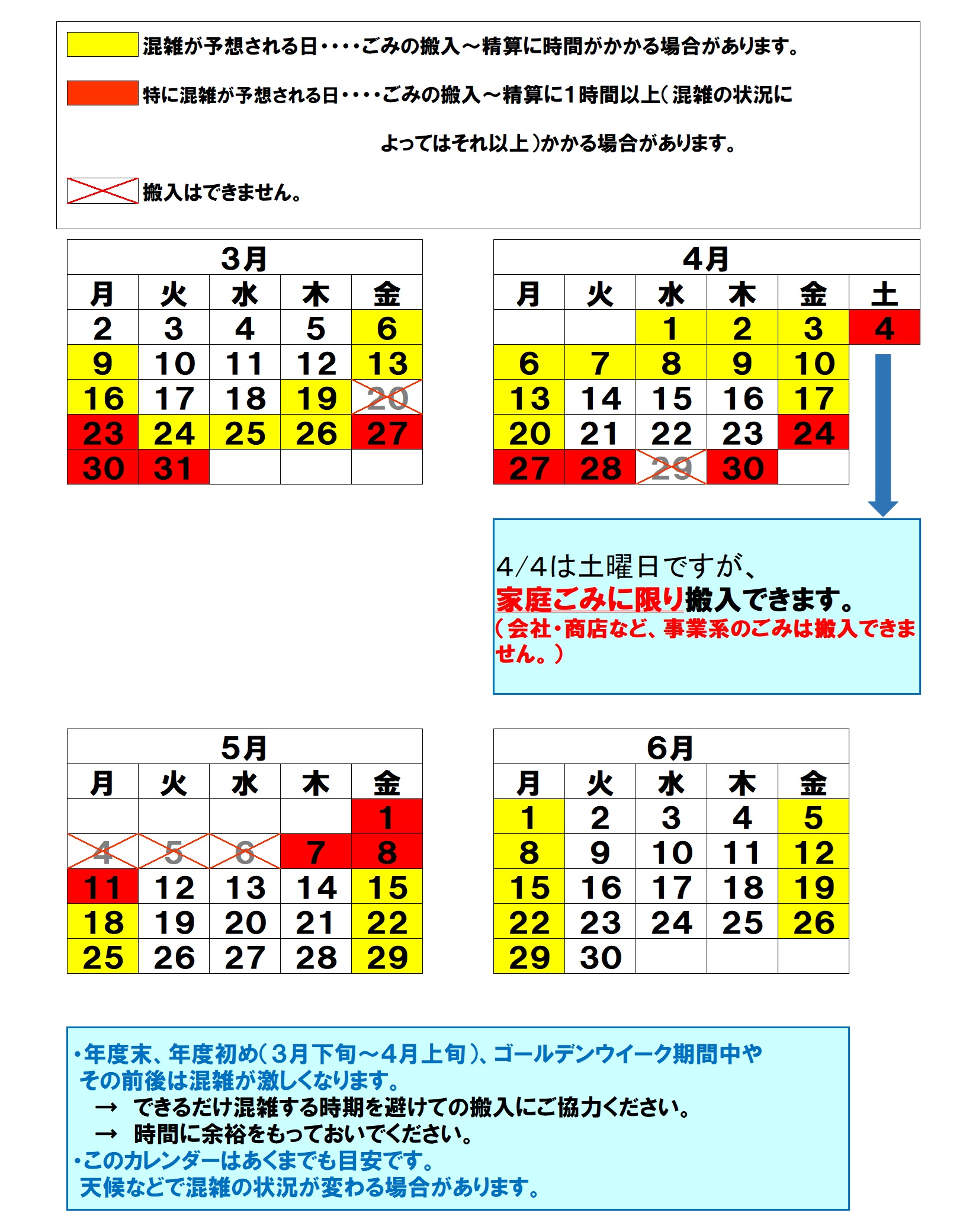 搬入や精算に時間がかかることがありますので、できるだけ混雑する時期を避けるよう、ご協力ください。