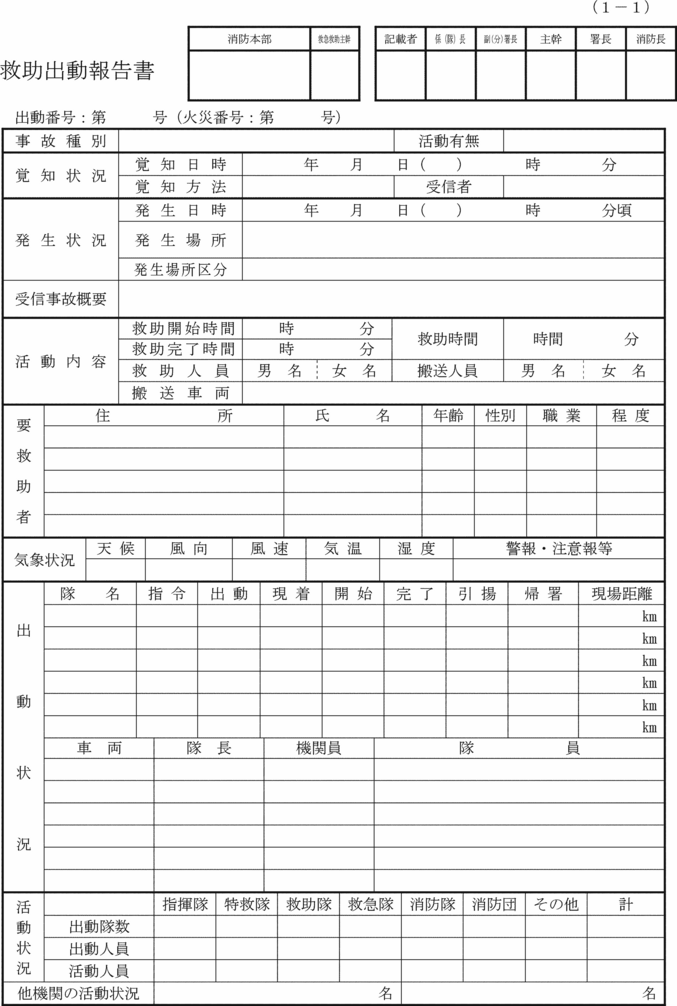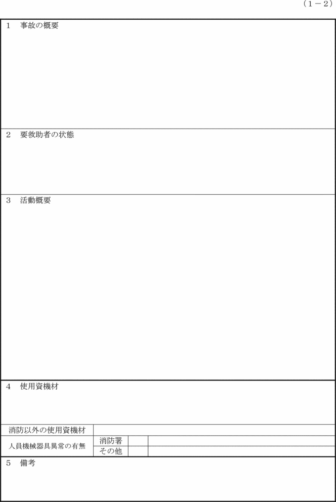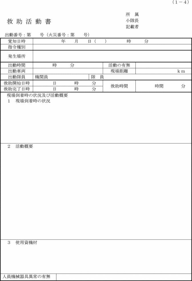 ○置賜広域行政事務組合消防本部救助規程 平成24年4月1日消防本部訓令第9号 改正 平成28年3月31日消本訓令第2号 置賜広域行政事務組合消防本部救助規程 (趣旨) 第1条 この規程は、消防法(昭和23年法律第186号)第36条の2の規定に基づき救助業 務の適切かつ円滑な運営を図るため必要な事項を定めるものとする。 (用語の定義) 第2条 この規程における用語の意義は、次の各号に定めるところによる。 (1) 要救助者 災害により生命又は身体に危険が及んでおり、かつ、自らその危険を 排除できないものをいう。 (2) 救助活動 要救助者の危険を排除し、又は安全な状態に救出することをいう。 (3) 救助隊 救助隊の編成、装備及び配置の基準を定める省令(昭和61年自治省令第 22号。以下「省令」という。)に定める基準に従い、救助資器材を装備した隊をいう。 (4) 救助隊員 救助隊を編成する消防吏員をいう。 (5) 救助隊長 最上位の救助隊員をいう。 (6) 特別救助隊 救助隊のうち省令第4条第1項に規定する救助隊をいう。 (7) 特別救助隊員 特別救助隊を編成する消防吏員をいう。 (8) 特別救助隊長 特別救助隊の最上位の特別救助隊員をいう。 (救助隊の設置及び出動) 第3条 消防署に救助隊を置く。ただし、米沢消防署においては特別救助隊とする。 2 救助隊は、出動の命を受けた火災、救助等の現場に出動するものとする。 3 特別救助隊は、前項に定める場合のほか災害の規模等により消防長及び消防署長(以 下「署長」という。)が必要と認めたときに出動するものとする。 (救助隊員及び特別救助隊員の資格) 第4条 救助隊員は、次の各号のいずれかに該当する消防吏員をもって充てる。 (1) 消防大学校における救助科又は消防学校教育訓練の基準(平成15年消防庁告示第 3号)に規定する消防学校における救助科を修了した者 (2) 消防長が救助活動に関し必要な知識及び技術を有すると認めた者 2 特別救助隊員は、前項で定める救助隊員から特に優れた知識及び技術を有すると消防 長が認めた者をもって充てる。 (責務) 第5条 救助隊長又は特別救助隊長は、上司の命令を受けて所属の隊員を指揮監督し、救 助業務の円滑な遂行に努めなければならない。 2 救助隊員又は特別救助隊員は、隊長の指揮監督に従うとともに、相互に連携し、救助 隊の任務遂行に従事しなければならない。 (出動車両) 第6条 救助隊等の出動車両は、次の各号による。 (1) 救助隊の出動車両は、救助工作車、ポンプ車等とする。 (2) 特別救助隊の出動車両は、救助工作車、はしご車等とする。 (教育訓練) 第7条 署長は、隊員が救助活動を行うために必要な知識及び技術の修得並びに体力の向 上を図るための教育訓練を計画的に実施するよう努めるとともに、隊員の安全管理に十 分配慮しなければならない。 2 隊員は、平素から救助活動を行うために必要な知識及び技術の修得並びに体力の向上 を図ることにより、いかなる災害にも適切に対応できる臨機の判断力及び行動力を養う よう努めなければならない。 (救助調査) 第8条 署長は、救助活動の適切かつ円滑な実施を図るため、次の各号に定める状況等を 調査するものとする。 (1) 地勢及び交通の状況 (2) 救助活動の必要がある災害の発生するおそれのある場所及び地形の状況 (3) 救助活動の実施が困難と予想される対象物の位置及び構造並びに管理状態 (4) 前3号に掲げるもののほか署長が必要と認める事項 (連携) 第9条 救助活動を行うに当たっては、各署の救助隊、消防隊及び救急隊と緊密な連携の もとに活動するものとする。 2 署長は、必要に応じ関係機関と密接な連携をとるものとする。 (救助活動の中断) 第10条 署長は、災害の状況、救助活動に係る環境の悪化、天候の変化等から判断して救 助活動を継続することが著しく困難であると予測される場合又は隊員の安全確保を図る うえで著しく危険であると予測される場合においては、救助活動を中断することができ るものとする。 (評価等) 第11条 署長は、特異な救助活動事例その他必要と認める事例があった場合は、これらの 事例の分析及び評価を行い、その問題点及び改善点を明らかにし、救助活動及び隊員の 教育訓練に反映させることにより、救助活動の充実強化を図るよう努めるものとする。 (救助活動の記録及び報告) 第12条 隊長は、救助活動を行った場合は、救助活動報告書(別記様式)に所要の事項を 記録し、消防長に報告するものとする。 附 則 この訓令は、平成24年4月1日から施行する。 附 則(平成28年3月31日消本訓令第2号) この訓令は、平成28年4月1日から施行する。 別記様式