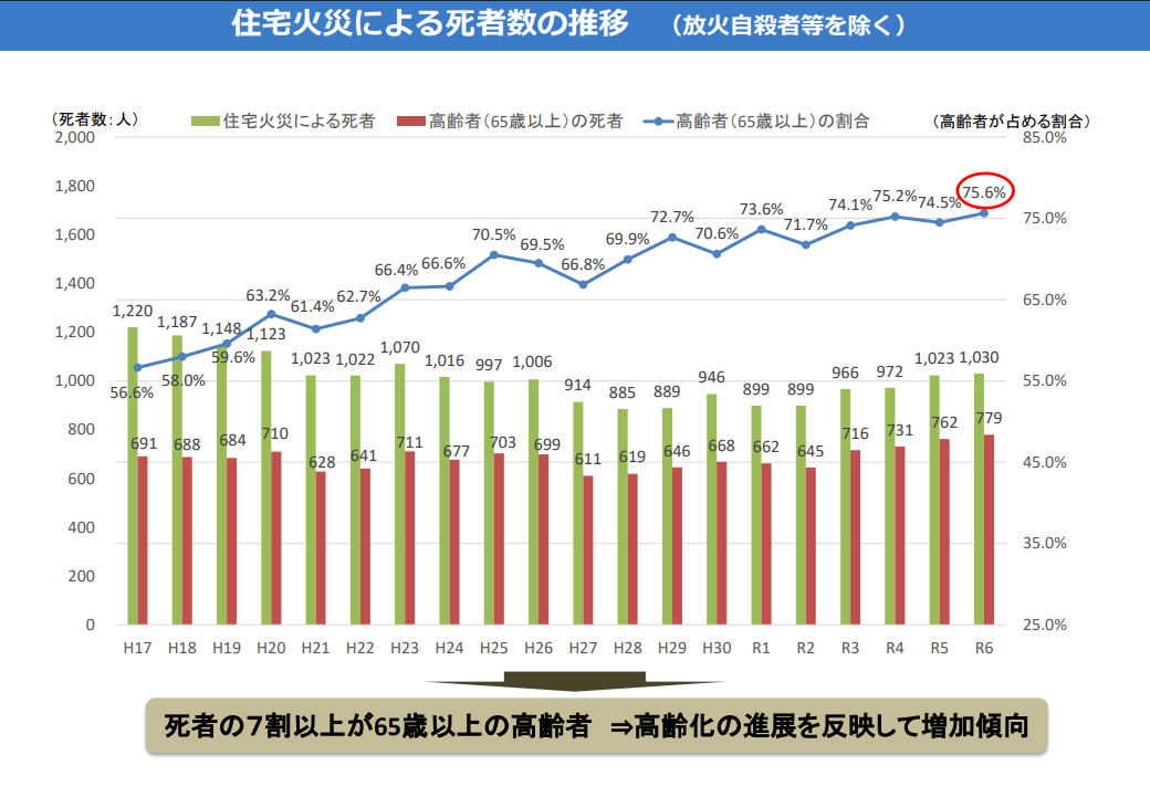 住宅火災における死者(放火自殺者等を除く)のうち約7割が65歳以上の高齢者となっており、近年の高齢化社会の進展とともに、この割合がさらに増加することが懸念されています。こういた状況を打破するためには高齢者の方が注意をするのみでなく、周りのご家族や地域の方々の力添えが重要となります。